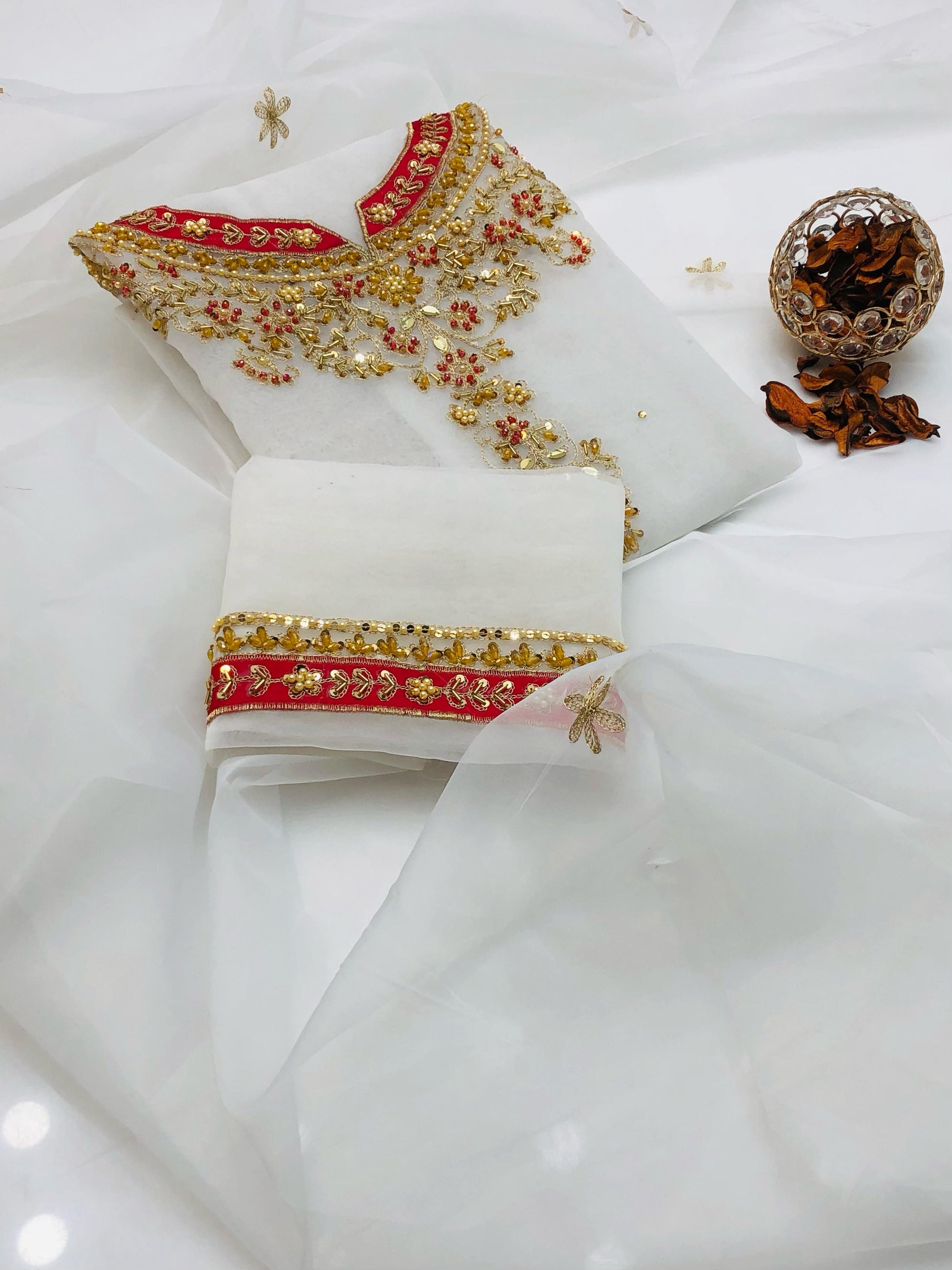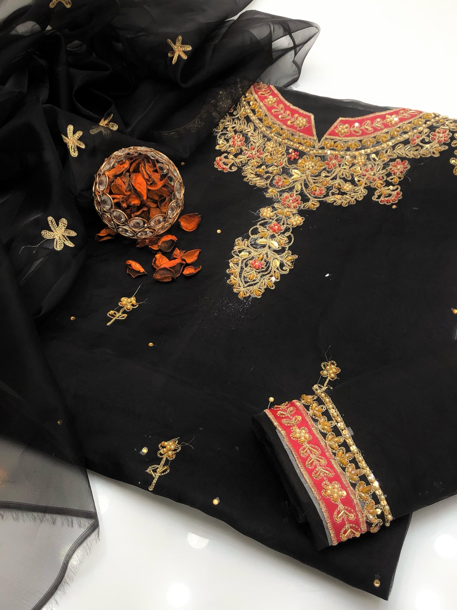 Fabric: Organza shirt crafted with model-style appliqué and zari bead detailing, paired with organza dupatta adorned with mini bunches embroidery
