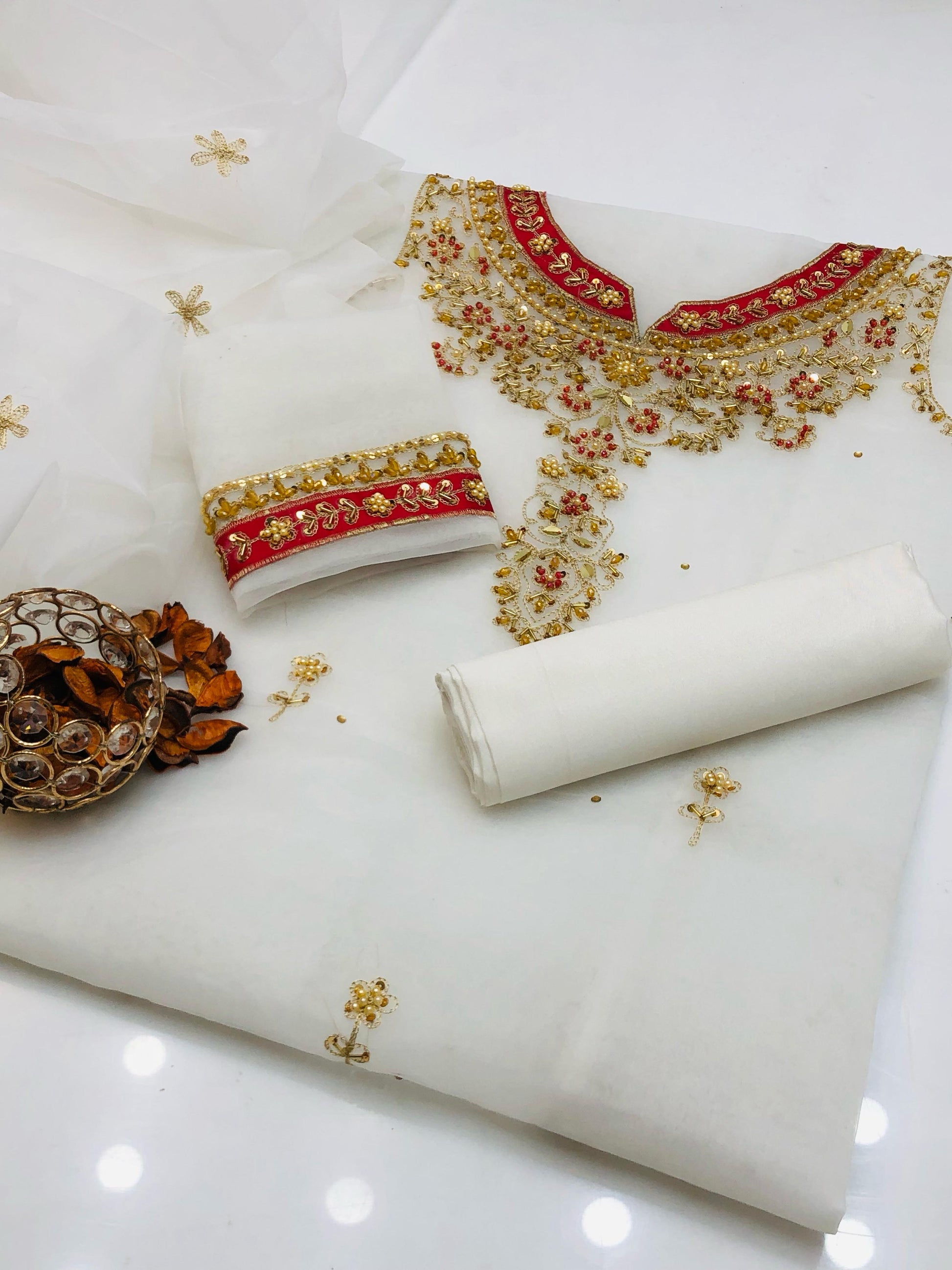 Fabric: Organza shirt with designer appliqué and zari beads, paired with mini bunch embroidered dupatta and kataan silk trouser