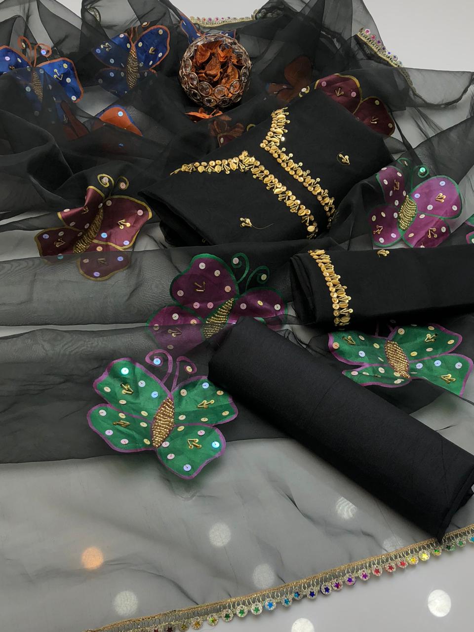 Fabric: Premium organza shirt with handmade beadwork and painted sleeves, paired with an original butterfly work dupatta finished with Indian sika malti lace, and plain kataan silk trouser