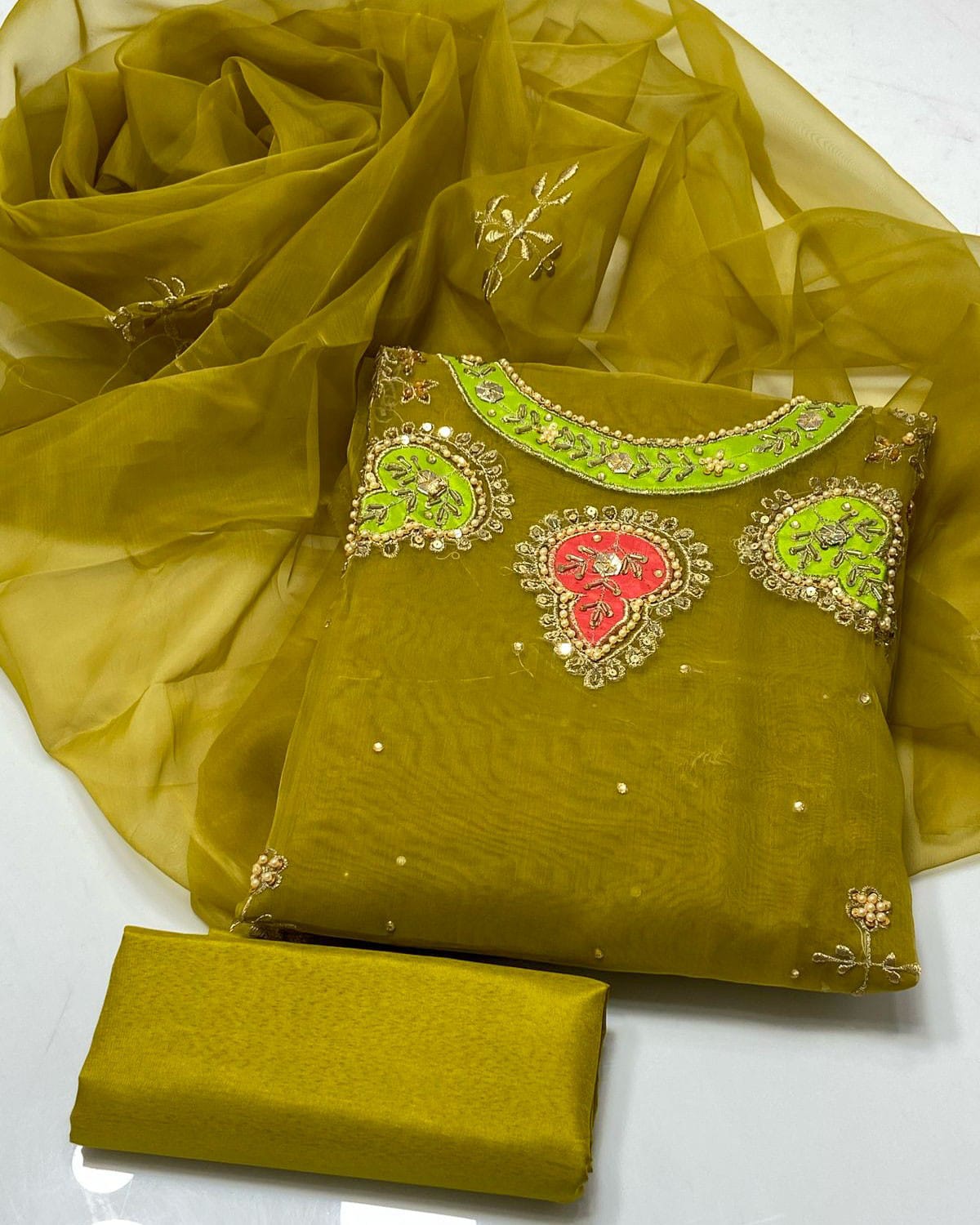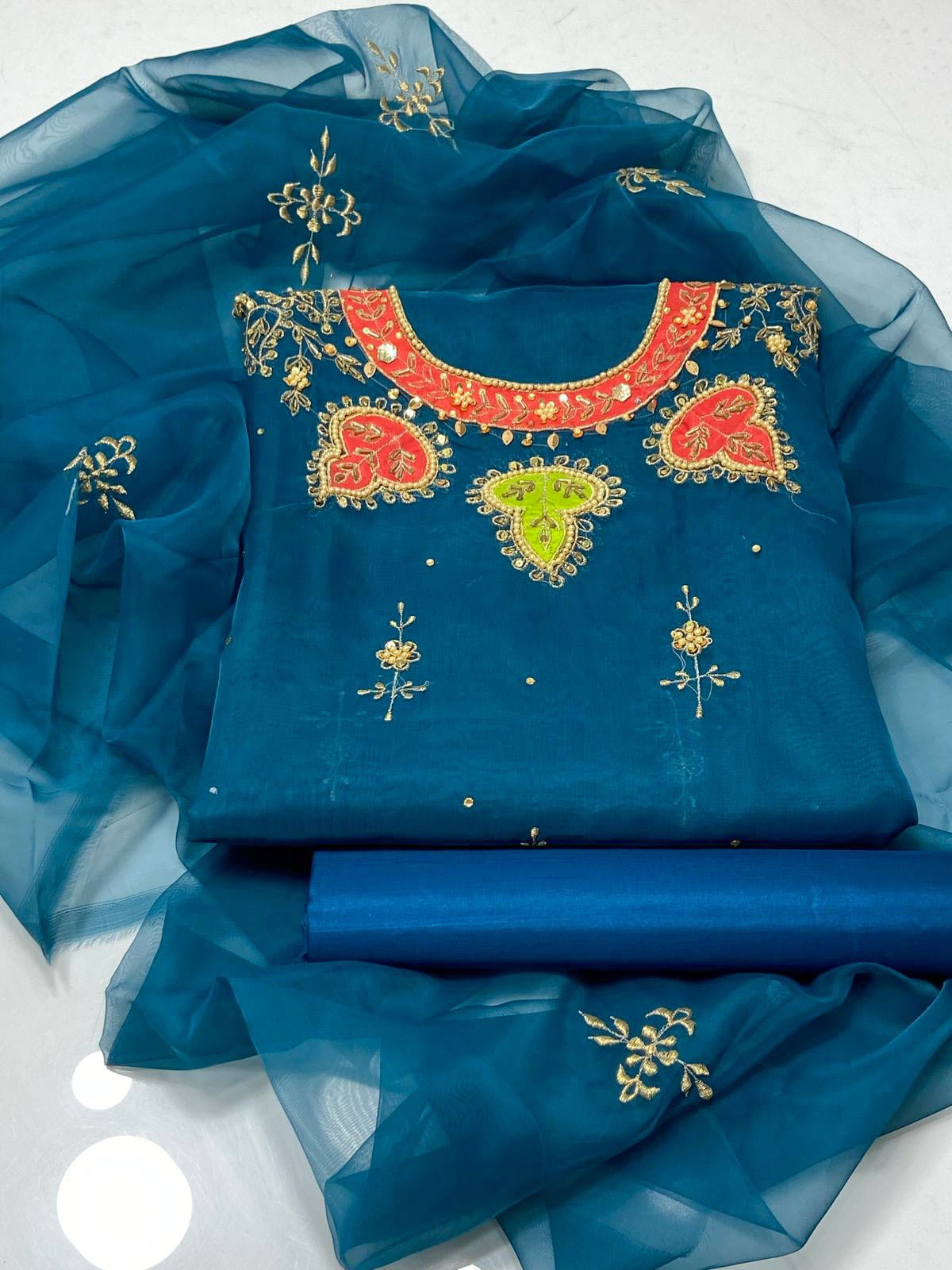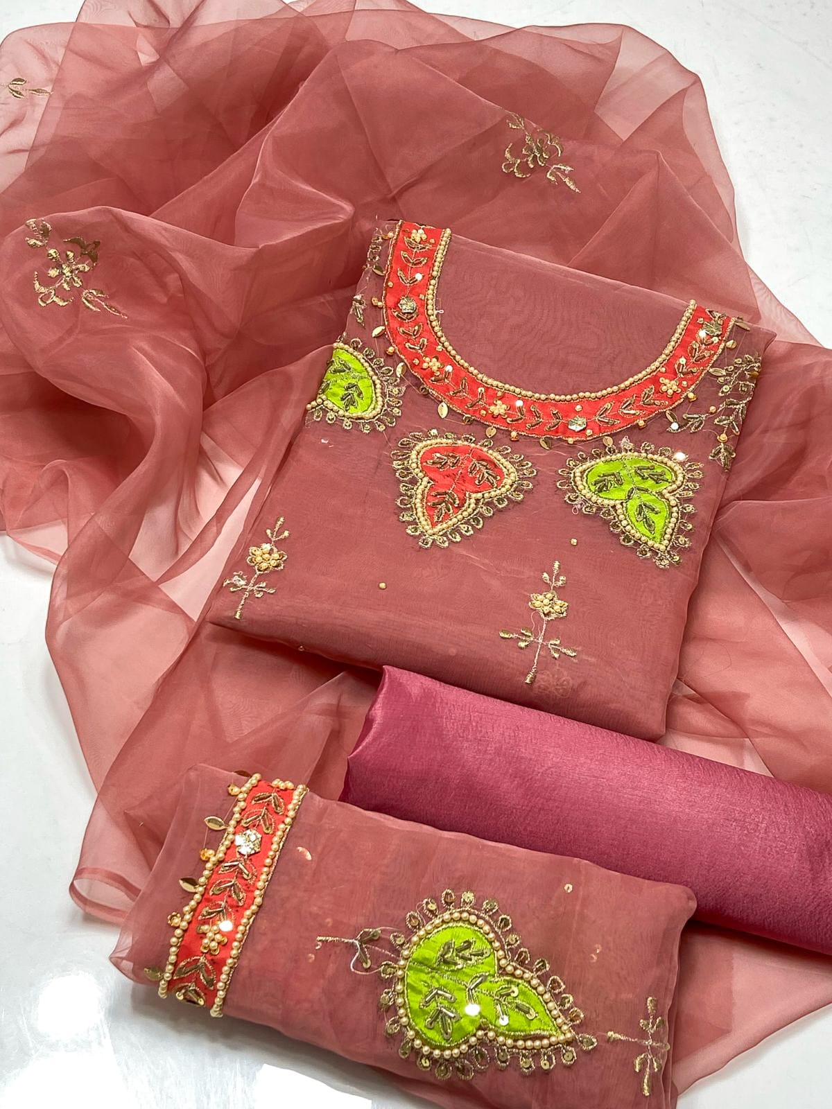 Fabric: Organza shirt with reta embroidery, leaf appliqué and zari beads work, paired with embroidered sleeves, organza dupatta with mini bunches embroidery, and plain kataan silk trouser.