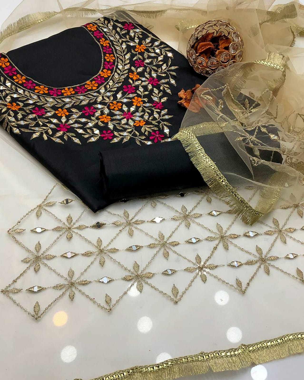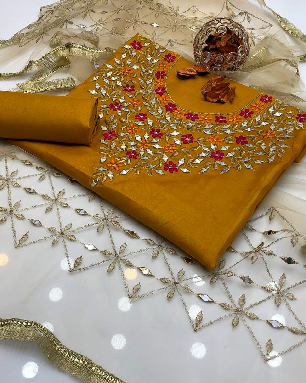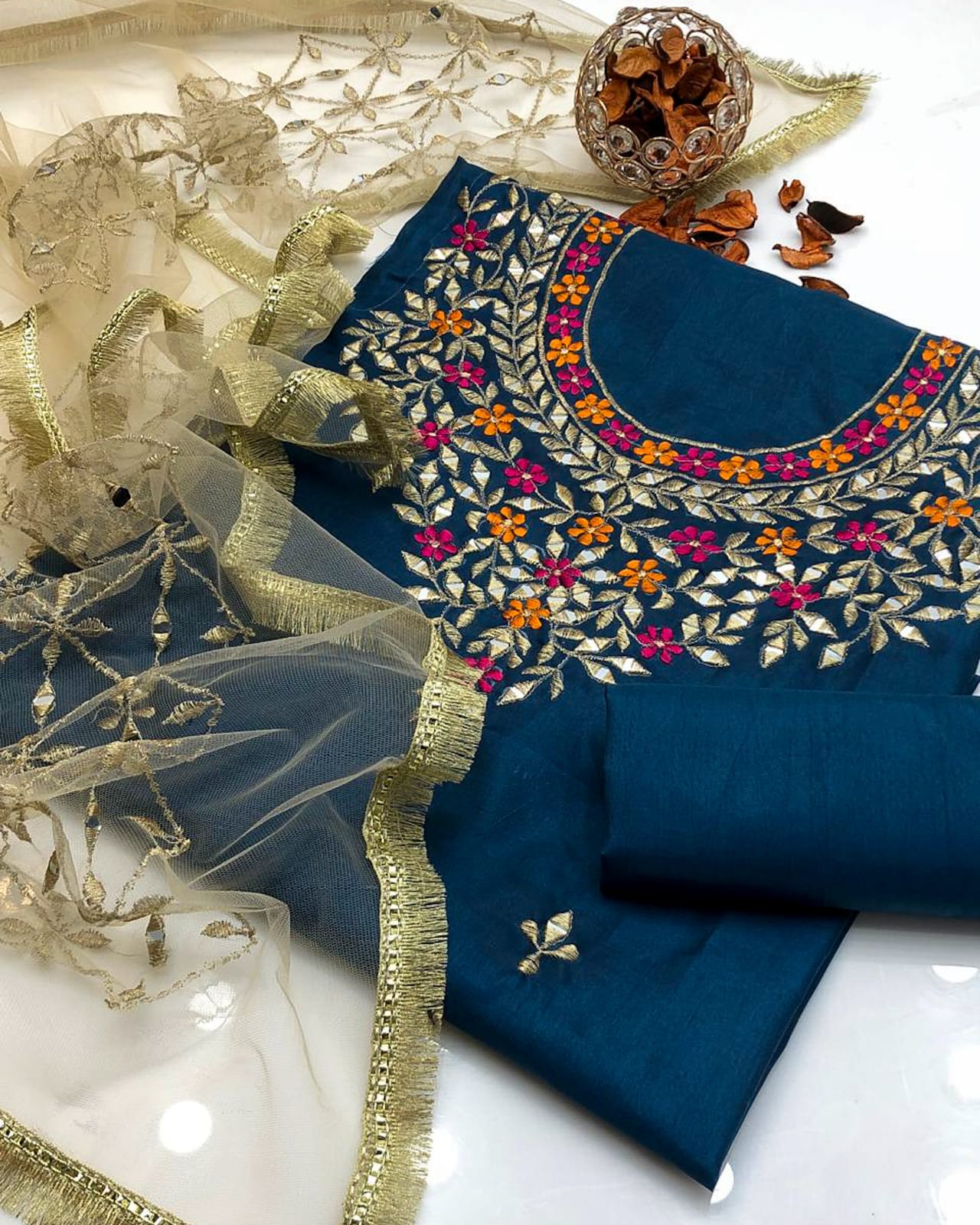 Work: Multi reta embroidery and mirror work on shirt and net dupatta with bunches and 4-border lace