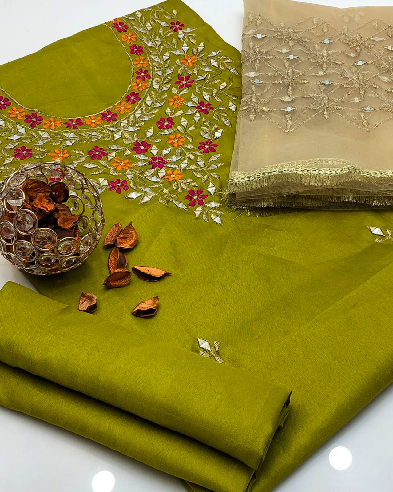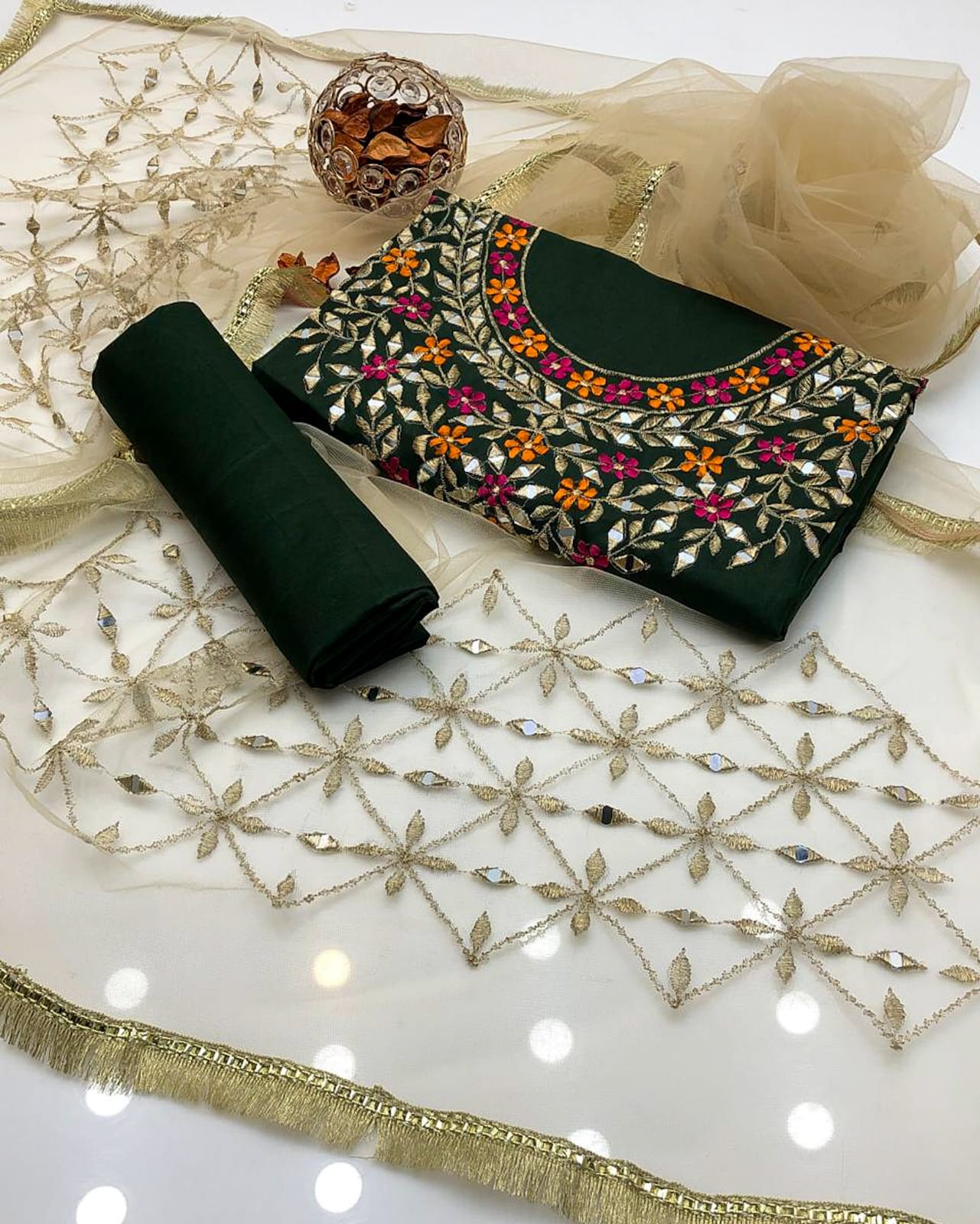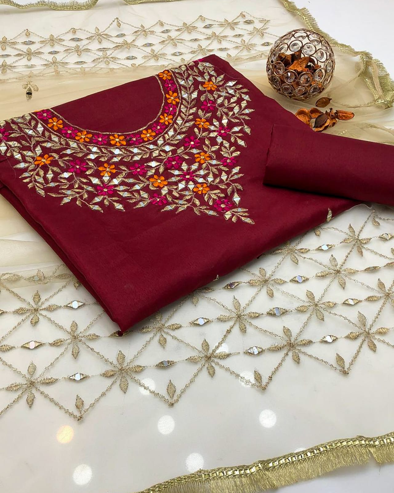 Work: Multi reta embroidery and mirror work on shirt and net dupatta with bunches and 4-border lace