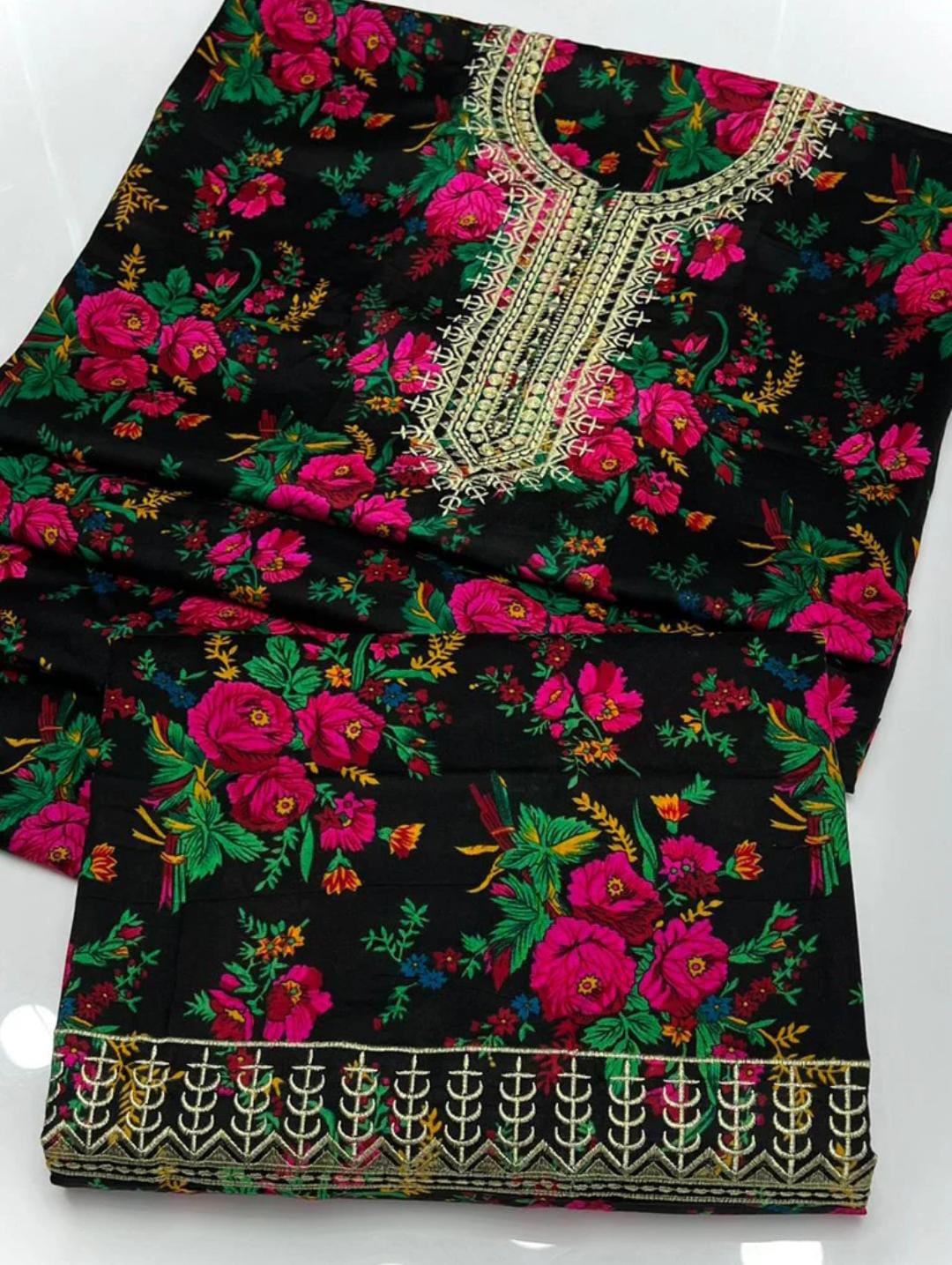 Work: Embroidered neckline with elegant all-over print