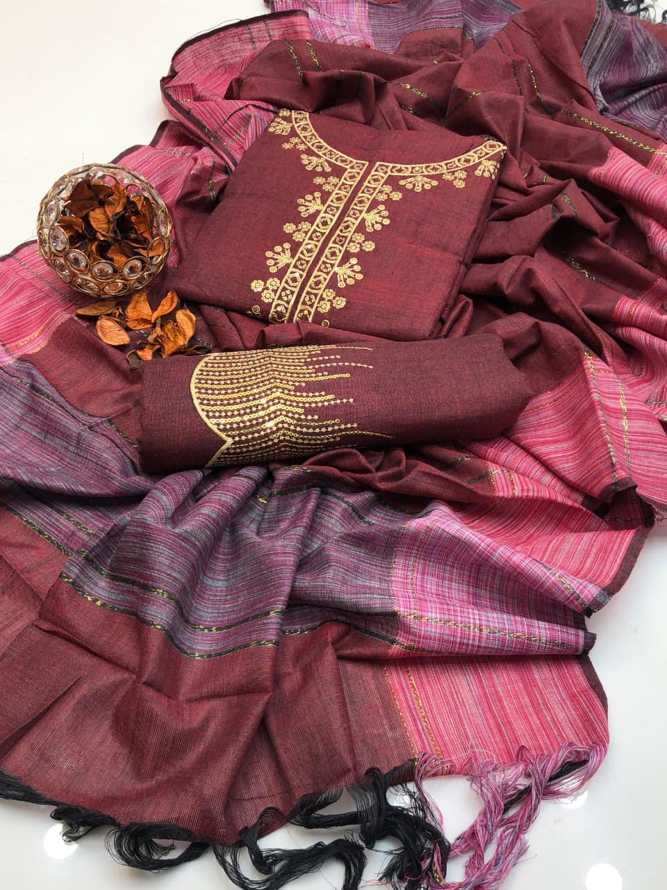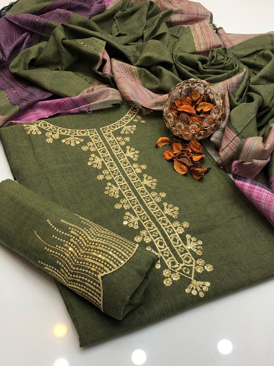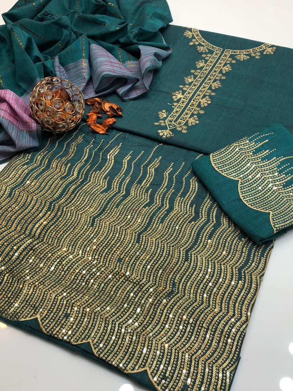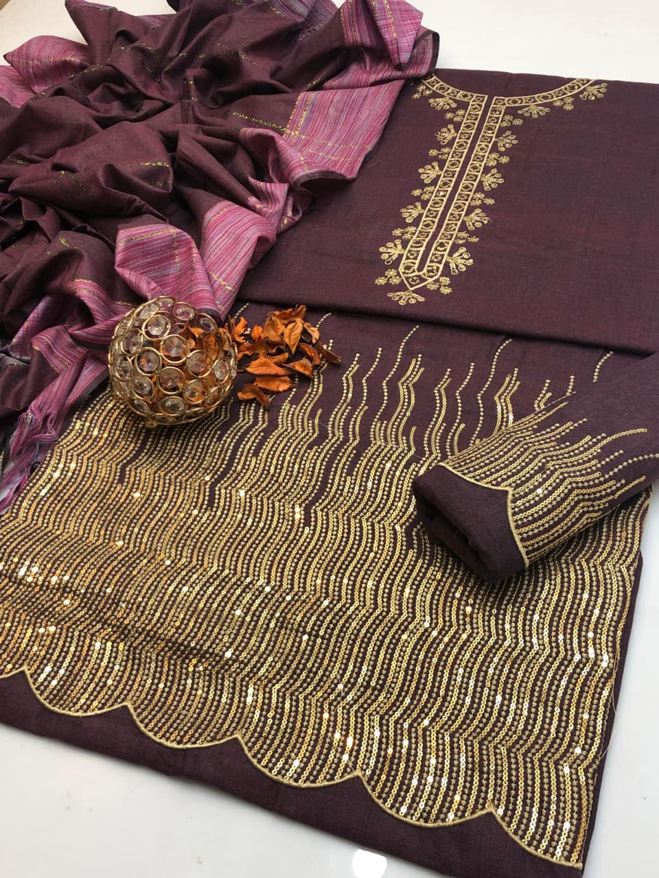 Details: Stylish sussi khaddar shirt with matching trouser and elegant zari shawl – warm and graceful for winter wear
