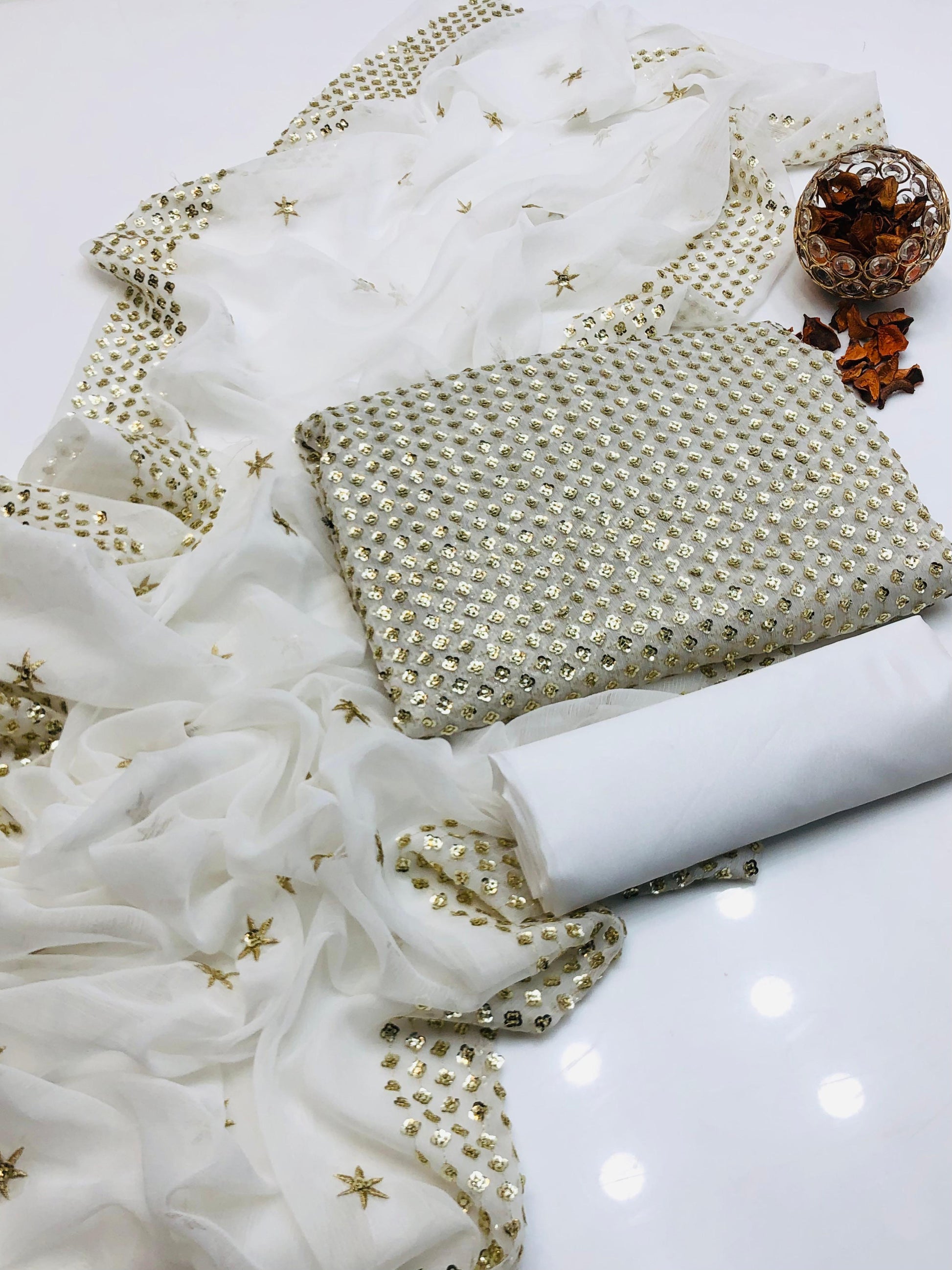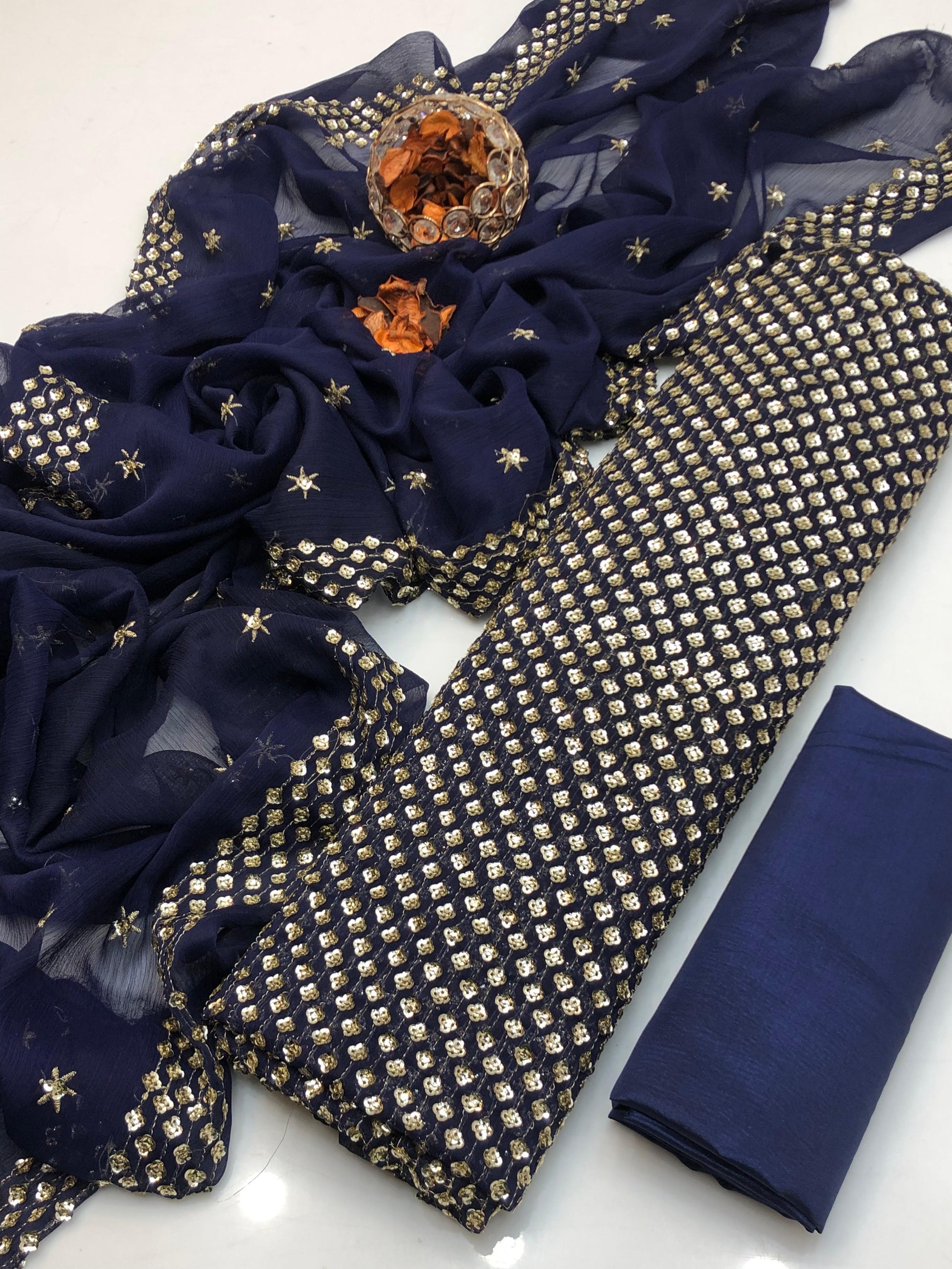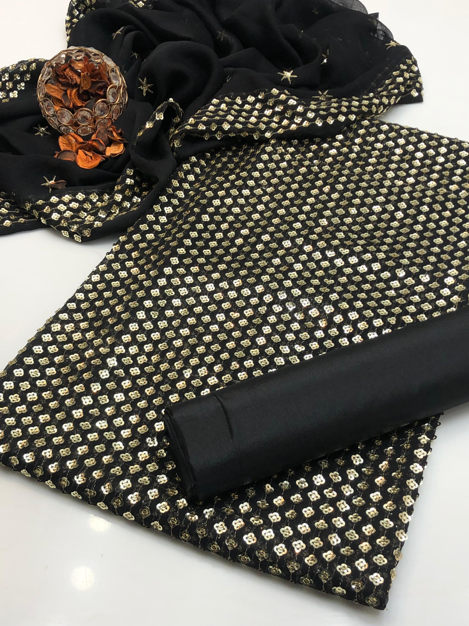 Details: Full embroidered shirt (front, back & sleeves) with chiffon embroidered dupatta (2 side border) and plain kataan silk trouser